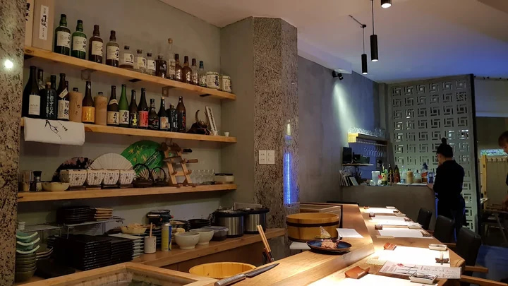 Không gian được thiết kế bởi kiến trúc sư người Nhật - gỗ hinoki, ánh sáng vàng ấm, quầy sushi dài với 12 ghế ngồi đối diện trực tiếp với itamae. Không có bàn riêng lẻ. Không có màn hình TV. Không có tiếng ồn nền. Chỉ có bạn, đầu bếp và những miếng sushi được tạo ra ngay trước mắt bạn.