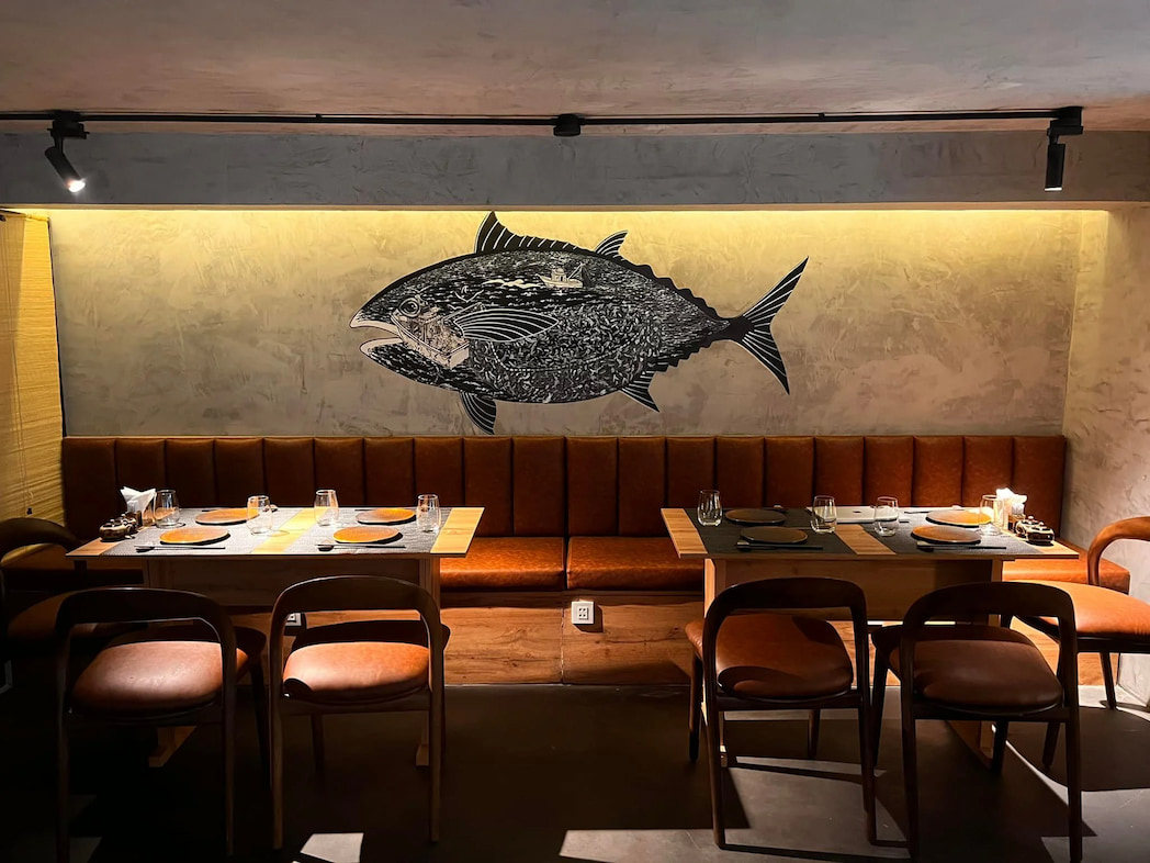 Không gian Maguro Studio thiết kế theo phong cách funky và hiện đại - graffiti cá ngừ vây xanh trên tường, ánh sáng công nghiệp, mô hình cá ngừ treo trần - hoàn toàn khác với sự yên lặng trang trọng của Sushi REI hay Kasen. Đây là omakase cho thế hệ trẻ - thoải mái, sôi động, nhưng không kém phần tinh tế về chất lượng.
