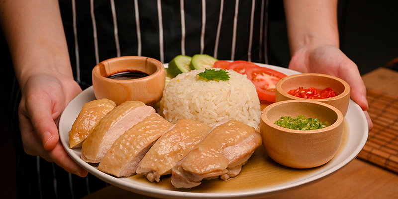- Cơm gà Hải Nam (Hainan Chicken Rice): Được mệnh danh là "món ăn quốc hồn quốc túy", cơm gà Hải Nam tuy giản dị nhưng lại đòi hỏi sự tỉ mỉ cực cao. Những hạt cơm dẻo thơm được nấu từ nước dùng gà béo ngậy cùng gừng và lá dứa, ăn kèm với những miếng thịt gà luộc mềm mọng, da vàng óng ả. Điểm nhấn làm nên linh hồn của món ăn chính là bộ ba nước chấm: nước tương đậm đà, gừng xay nhuyễn và đặc biệt là tương ớt đỏ rực, cay nồng kích thích vị giác.