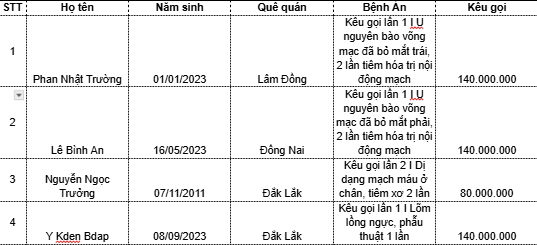 Kêu gọi lần 1 I U nguyên bào võng mạc đã bỏ mắt trái, 2 lần tiêm hóa trị nội động mạch |