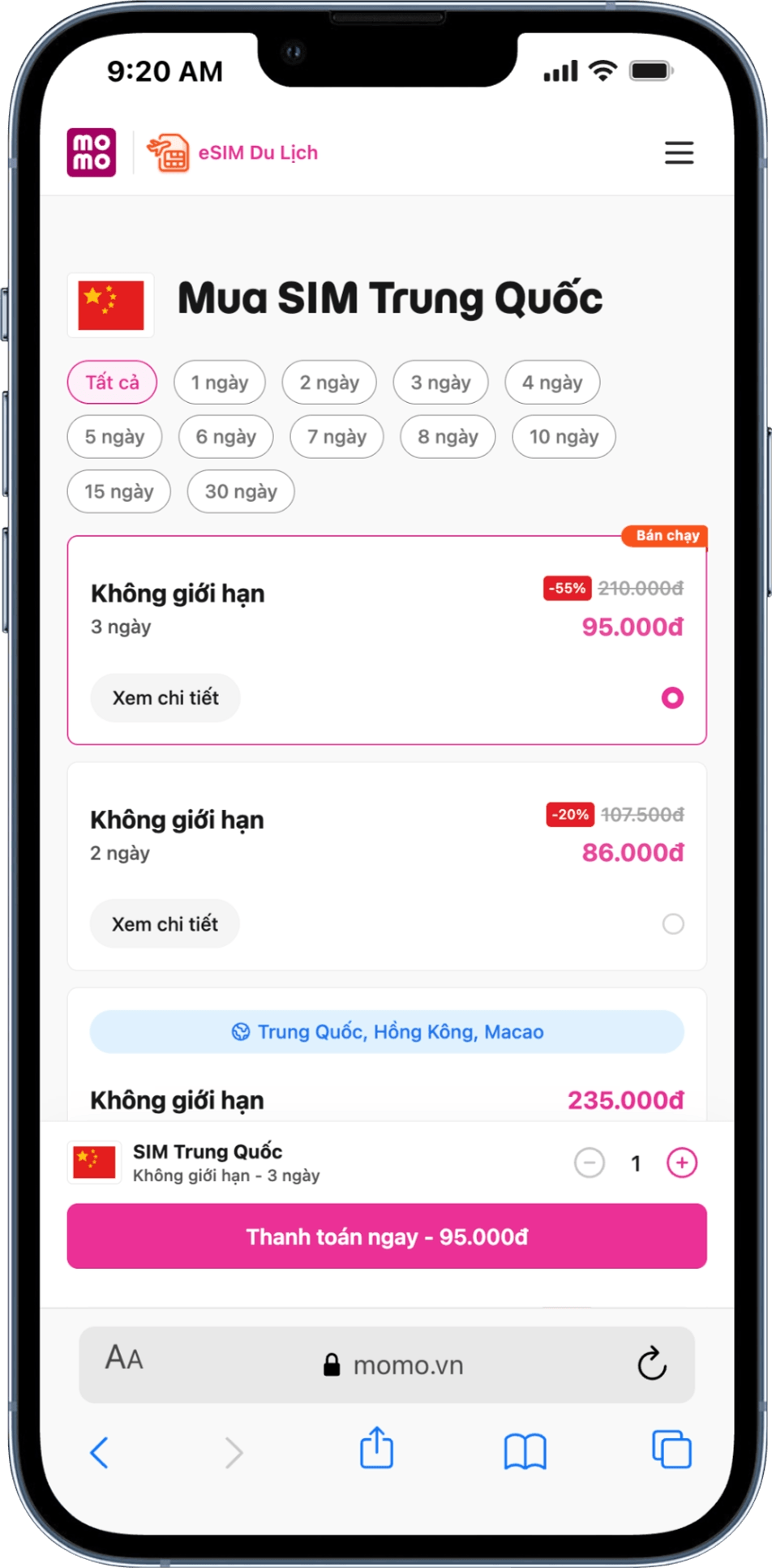 👍 Lưu ý MoMo: nếu bạn là khách hàng mới, nhập mã TRAVELSIM tại bước thành toán cuối cùng để được ưu đãi thêm tới 50%.