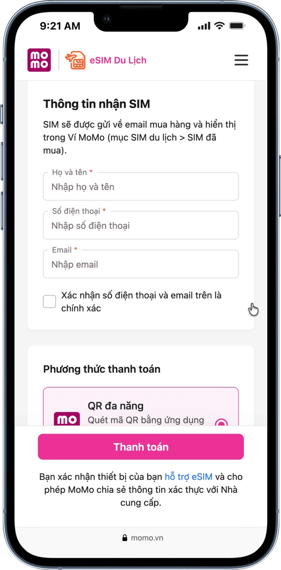 - Điền thông tin, hoàn tất thanh toán. Nhận QR kích hoạt eSIM ngay trên ứng dụng MoMo.
