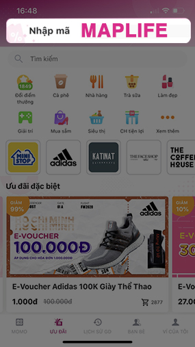 2. Thứ tự tham gia các chương trình ưu đãi: Nhập mã “HELLOMOMO” nhận gói quà 500.000đ >> Nhập mã “MAPLIFE” nhận thẻ quà 100.000đ.