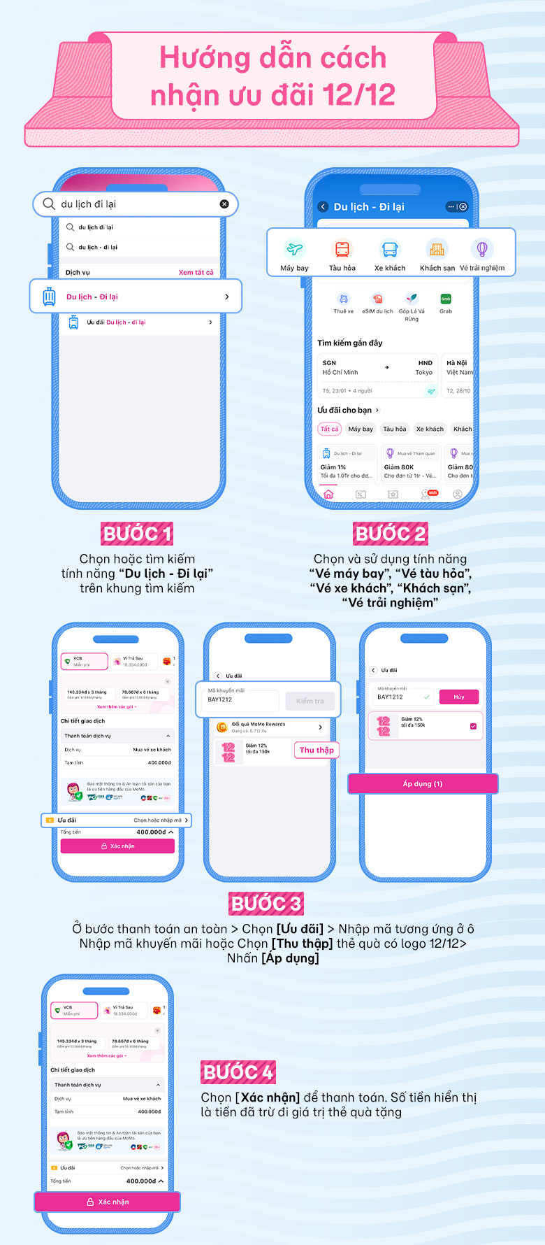 - Vô số ưu đãi liên tục theo tháng, quý, các dịp lễ và mùa cao điểm, Bên cạnh đó, MoMo Travel hợp tác với mạng lưới đối tác rộng khắp, tạo nhiều deal giảm trực tiếp trên giá vé hiển thị.