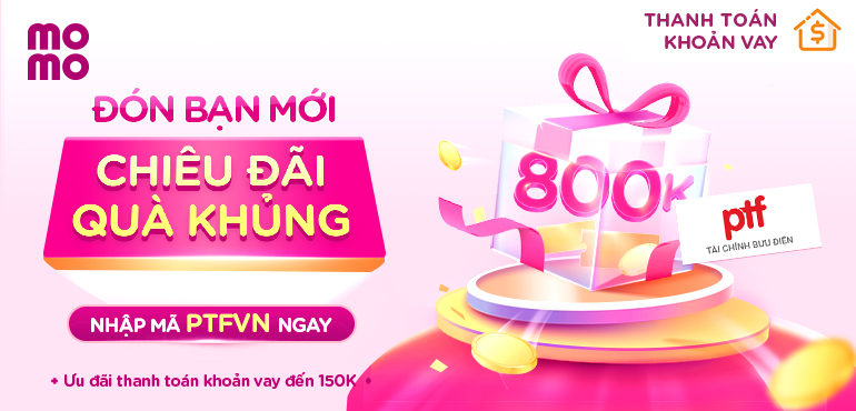 Bạn mới lần đầu tải MoMo và nhập mã "PTFVN" sẽ nhận được gói quà khủng 800.000đ thanh toán đa dịch vụ, bao gồm các thẻ quà ưu đãi đến 150.000đ khi thanh toán khoản vay.