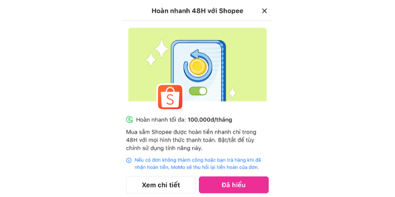 Dòng nhắn gửi ấy của chị Ngọc là động lực để mang lại lợi ích nhanh chóng nhất cho người dùng của MoMo. Chính vì vậy, thay vì phải chờ đợi mòn mỏi đến 60 ngày như trước, MoMo đã bắt tay ngay vào việc rút ngắn với tính năng Hoàn nhanh Shopee 48H. Bạn có thể nhận tiền trong 48 giờ cho đơn hàng Shopee ngay cả khi không thanh toán bằng MoMo. Chỉ cần dán link sản phẩm vào Hoàn Tiền Mua Sắm và được điều hướng sang sàn, bạn vừa tận dụng được ưu đãi từ sàn, vừa nhận tiền hoàn nhanh chóng. Ngoài ra, bạn hoàn toàn có thể chủ động bật/tắt tính năng này để phù hợp nhất với nhu cầu và thói quen mua sắm cá nhân.