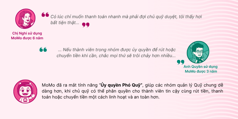 Tính năng Ủy quyền phó quỹ giúp chủ quỹ có thể phân quyền cho thành viên tin cậy để cùng rút tiền, thanh toán và chuyển tiền trực tiếp từ quỹ, vừa nhanh chóng, vừa an toàn.