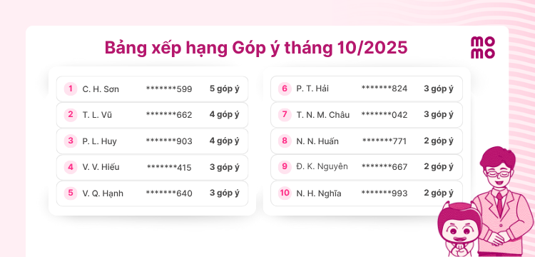MoMo xin gửi lời tri ân chân thành đến 10 người dùng có nhiều đóng góp nhất của tháng 10.