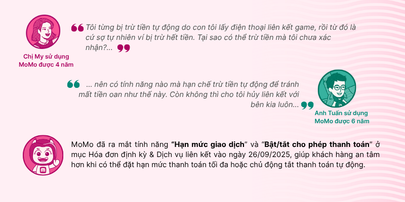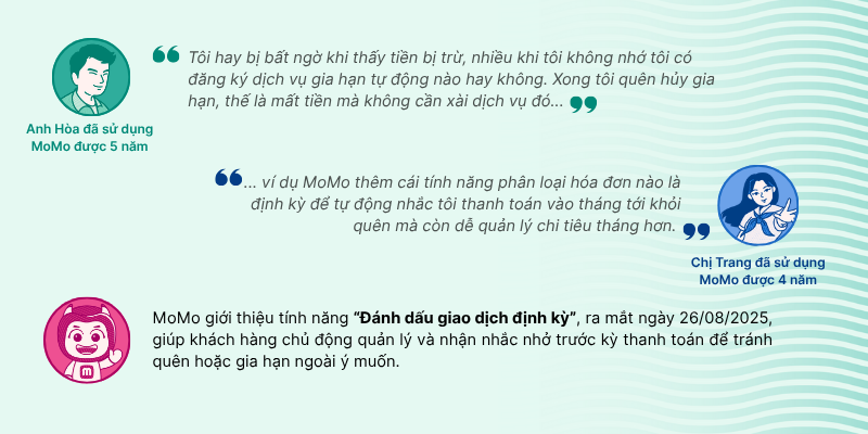 Khi liên kết MoMo để thanh toán, đôi lúc bạn quên rằng mình đã đăng ký gói gia hạn và bị trừ tiền tự động. Tính năng mới này giúp nhắc nhở rõ ràng, minh bạch để bạn luôn nắm được và kiểm soát chi tiêu chủ động hơn.