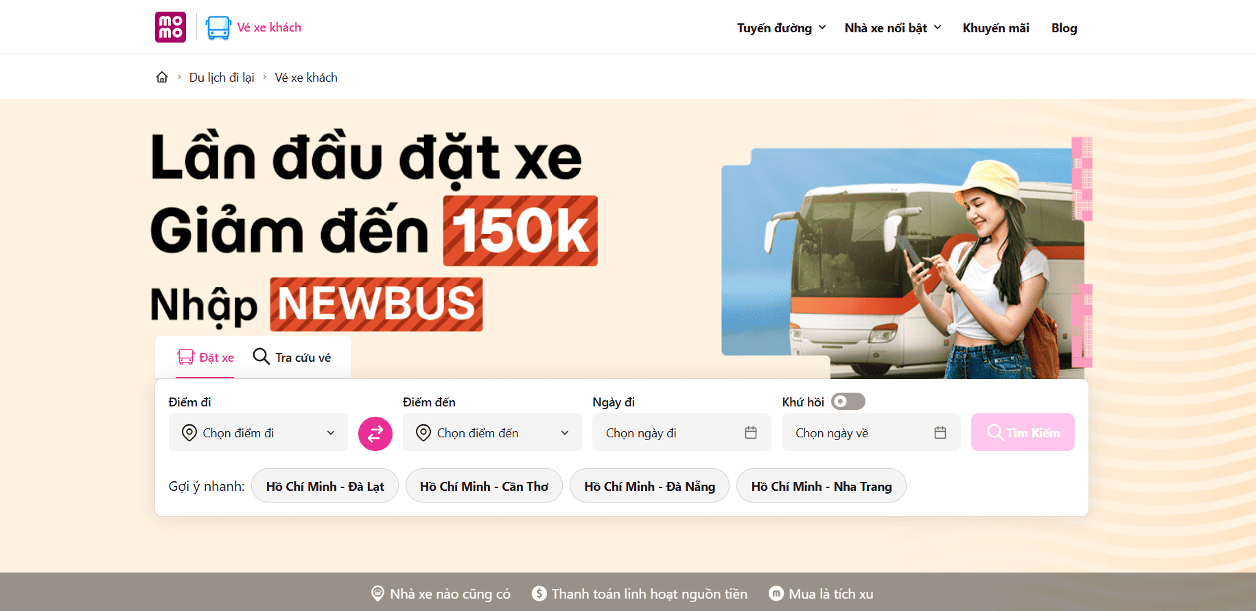 Trong tháng 9, MoMo cũng đã mở rộng tiện ích bằng việc ra mắt tính năng mua vé xe khách trực tiếp trên website MoMo. Bạn có thể tìm kiếm, đặt chỗ và thanh toán vé xe một cách linh hoạt bằng Ví MoMo hoặc ứng dụng ngân hàng/ví điện tử khác.