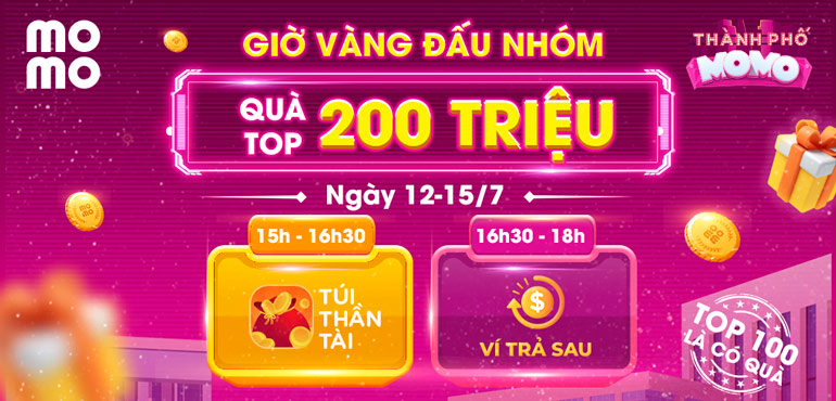 Từ 12/07 – 15/07/2021, trong khung Giờ Vàng 15H – 18H, người chơi Thành phố MoMo tham gia Đấu Nhóm và thắng trận bất kỳ sẽ nhận được giải thưởng từ Túi Thần Tài và Ví Trả Sau.